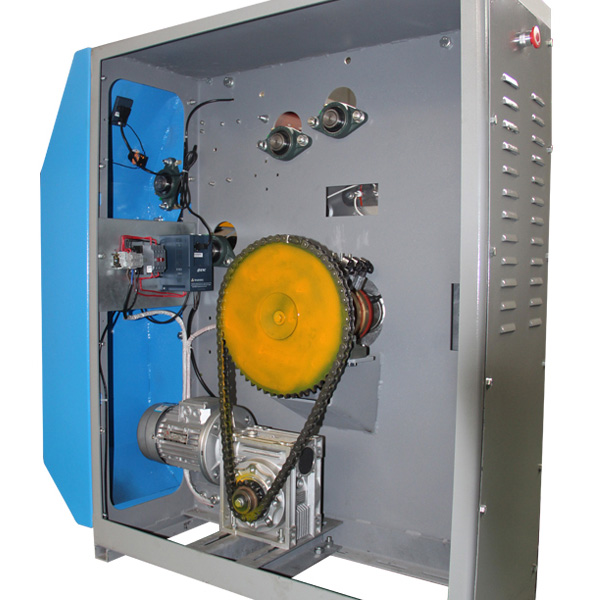 烫平机由电机通过皮带变速带动内胆转动、且在时序控制器作用下正反旋转,带动水和衣物作不同步运动,使水和衣物、织物与织物、织物与内筒壁等相互摩擦、揉搓,达到洗净的目的。采用一台三相异步电动机或一台调速电机(洗染机)作运转动力,当接通电源时,电源指示灯亮,三位开关控制点动、停止、自动,点动位置时点动指示灯亮,可实现点动对门;自动位置时运转指示灯亮,根据洗涤工艺要求选择洗涤时间,机器将在规定的时间内正反自动运转洗涤。机器内置过热、过载装置、定时装置、正反转控制装置。外筒门设有安全装置,若运行中门被打开,机器立即停止运转,确保机器、操作人员的安全。